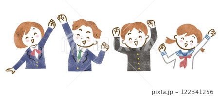 ガッツポーズしている制服を着た中高生男女4人の上半身イラストセット