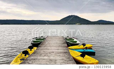 Lakeside Kayaking Dock featured with Vibrantly Colorful Kayaks set Beneath a Cloudy Sky