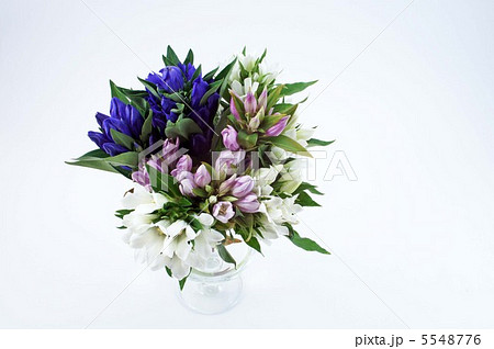 透明なガラスの花瓶に生けた花 リンドウ、セロシア、ルスカス