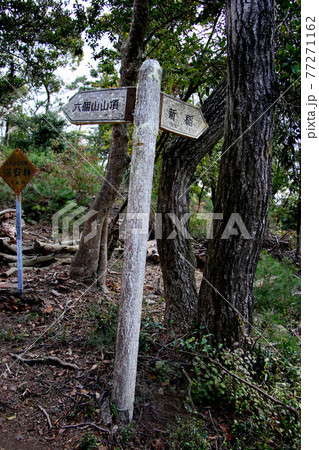 大阪府箕面市 箕面の森 六個山山頂 と 新稲 を示す行先表示板 全部 縦位置