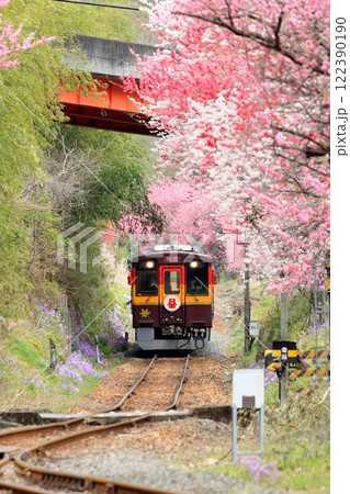 わたらせ渓谷鐵道「花桃と桜の花咲く風景を行く列車」