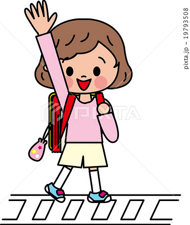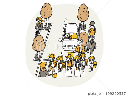 横断歩道で子供達を渡らせる地域員のイラストコミカルな手書きの人物 ベクター、線画にカラー
