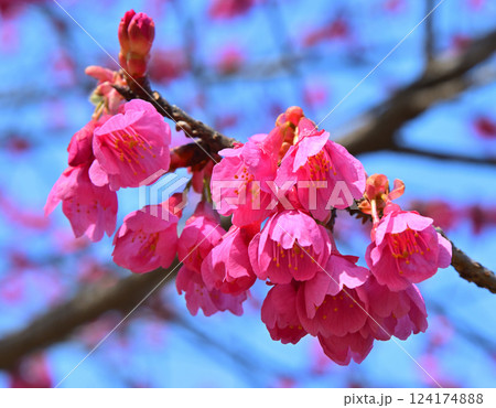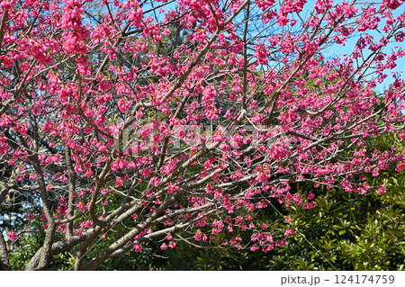 満開の寒緋桜 わらべ歌発祥の地 三芳野神社境内 川越市