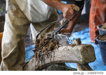 植木ごみを押し切りで細かくする