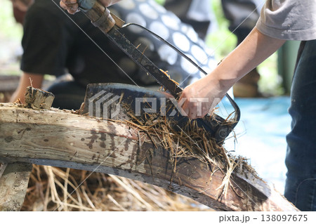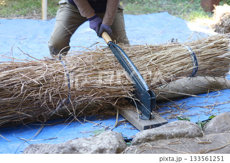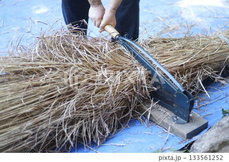 押切機で茅を切る様子