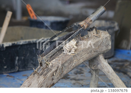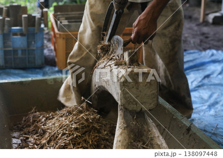 リュウゼツランの葉を押し切りで細かくする