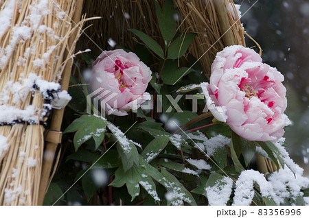 雪に覆われた藁囲い(ワラボッチ)の冬牡丹