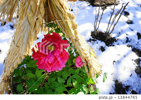 雪に覆われた藁囲い(ワラボッチ)の冬牡丹
