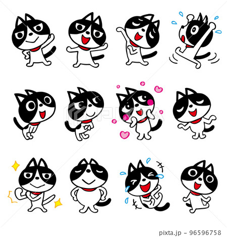 ハチワレネコのゆるい手描きポーズセット1 ベクター素材