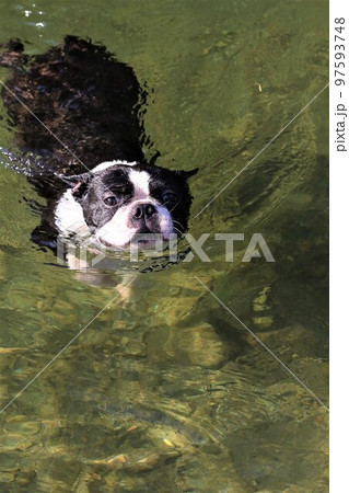 川遊びの人気スポットときがわ町の都幾川を泳ぎながら可愛く見つめるボストンテリアのマイティ君♡