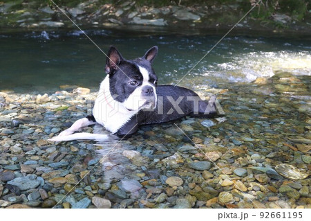 川遊びで人気のときがわ町の冷たい都幾川に入って気持ち良く渓流を眺める可愛いボストンテリアのマイティ君
