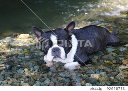 川遊びの人気スポットときがわ町の都幾川の水辺で気持ち良さそうな可愛いボストンテリアのマイティ君♡