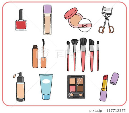 メイク用品の手書きイラストセット ブラシや化粧品、小物類など