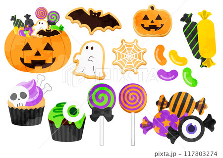 ハロウィンモチーフお菓子のかわいい手描きイラストセット