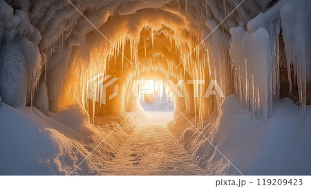 氷の洞窟に差し込む朝日