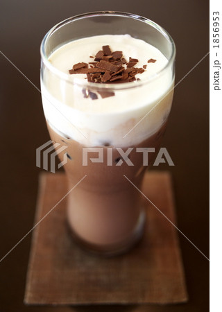 Mocha frappe in plastic cup. Served with whipping cream and chocolate sauce. Freshness drink. Favorite caffeine beverage menu.