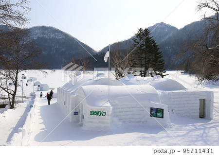 北海道 鹿追 しかりべつ湖コタン 結氷する然別湖とくちびる山