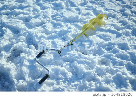 湖の氷に突き刺さったアイスドリル ワカサギ釣りイメージ