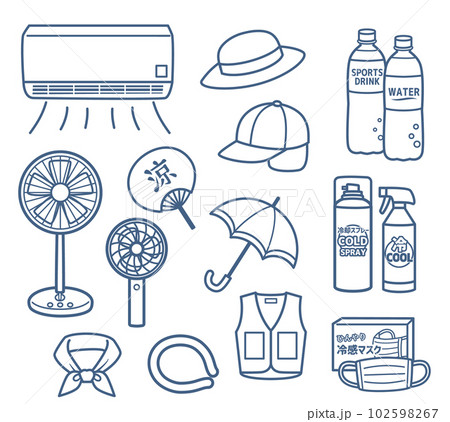 夏の暑さ・熱中症対策グッズ・家電のシンプル線画セット