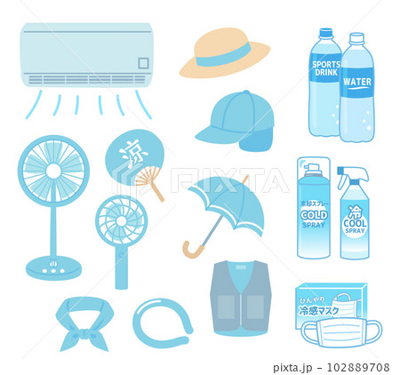夏の暑さ・熱中症対策グッズ・家電のシンプルイラストセット