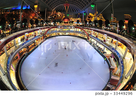 Ice skating rink near the shopping center. decorated for Christmas. In the evening