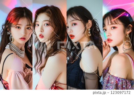 アイドル活動をしている女性グループのネオンカラーポートフォリオ(推し活・芸能界・スター・歌手・ダンス