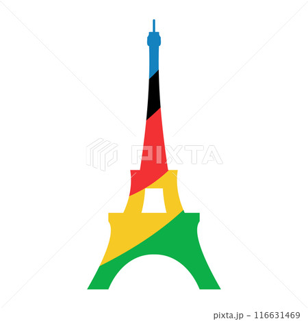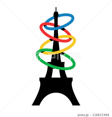 France 2024. French Eifel Tower in Paris. Symbol of sports games. Illustration of colored rings. Summer games vector logo.