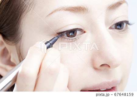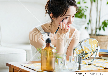 鏡を見ながらアイメイクをする若い女性 ビューティー イメージ