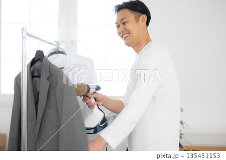 服にスチーマーをかける男性