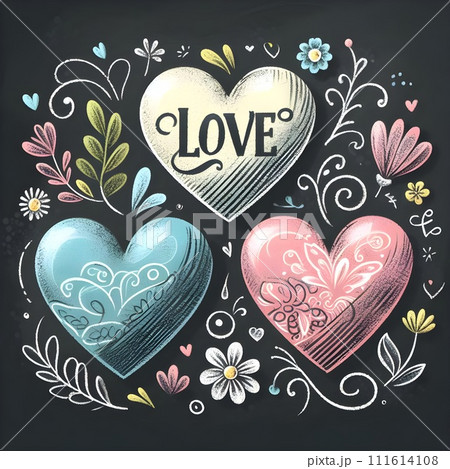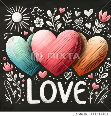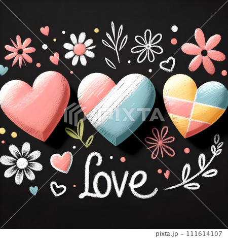 Chalk hearts of three different sizes and colors with the message "Love" on them.