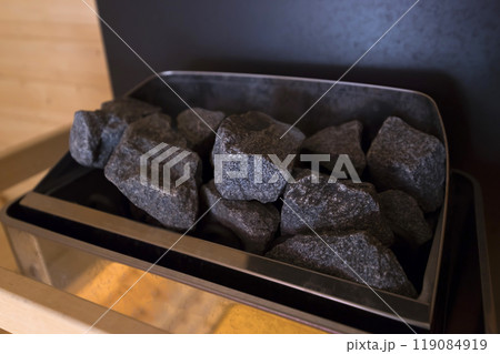 テントサウナ用の薪ストーブの上にサウナストーンを乗せる男性