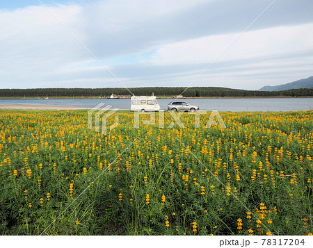柏原海岸 ルーピンとキャンピングトレーラー 鹿児島県肝属郡東串良町川東
