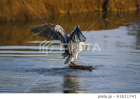 While fishing in the moving water a grey heron, Ardea cinerea successfully caught a fish.