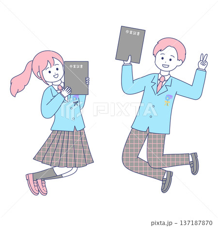 空欄の卒業証書とブレザーの制服を着た可愛い女の子と男の子 爽やかなイラスト