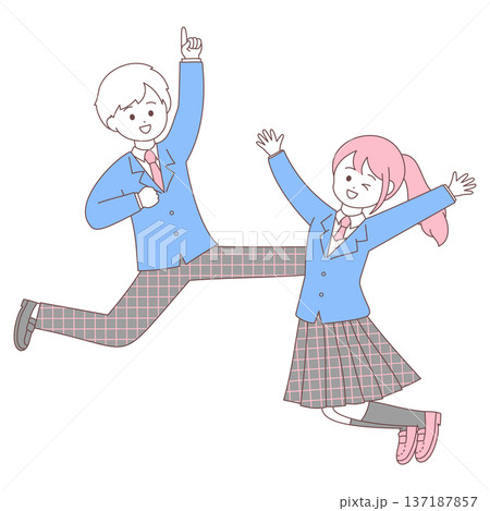 ジャンプする元気な高校生カップル|シンプルでかわいいイラスト