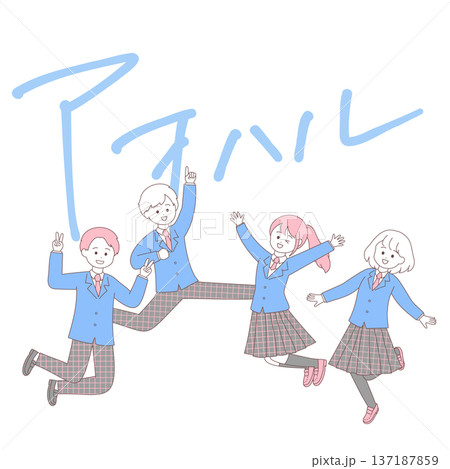 青春を謳歌する高校生たちのイラスト|「アオハル」の手書き文字の背景