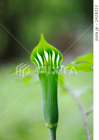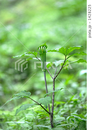自然 植物 マムシグサ、アオマムシグサ。初夏の林の中で緑色の仏炎苞が鎌首をもたげます