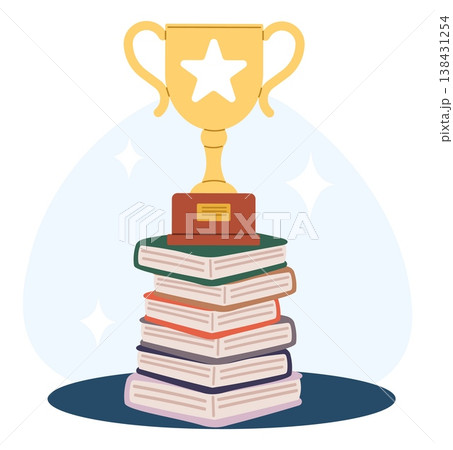 Golden trophy cup stands on stack of books. Representing acquisition of knowledge for success and victory. Education achievement. Literature contest. Award on textbooks. Vector concept