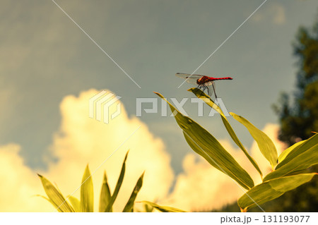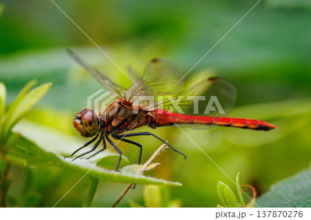 葉に止まる赤とんぼ トンボ科マユタテアカネ♂