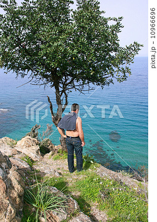 Tourist girl over Landscape of Akamas Peninsula National Park, Cyprus