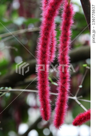 Acalypha hispida red blossom tree. Pink Chenille plants furry flowers, selective focus
