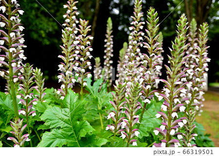 紫と白い花びらのアカンサスモリスの花が咲く風景