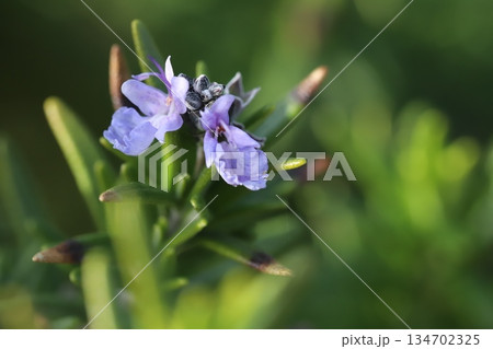 12月の冬の庭に咲く薄紫色のローズマリーの花