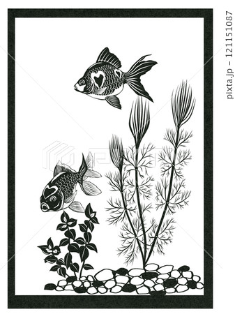優雅に泳ぐ和金魚と水草のアクアリュウムイラスト