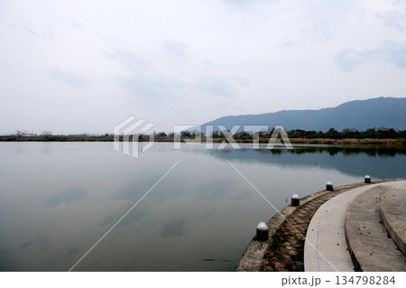 岐阜県海津市 初秋のアクアワールド水郷パークセンターの池と休憩用椅子とテーブル