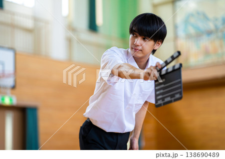 体育館でクラッパーボードを持つ男子学生