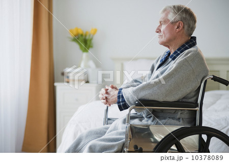 Thoughtful man in wheelchair on rooftop overlooking cityscape