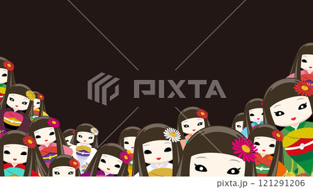 着物を着た、顔色が悪くて少し怖い目お菊人形がたくさん集まっている背景素材(黒背景)