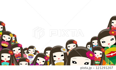 着物を着た、顔色が悪くて少し怖い目お菊人形がたくさん集まっている背景素材(透明背景)