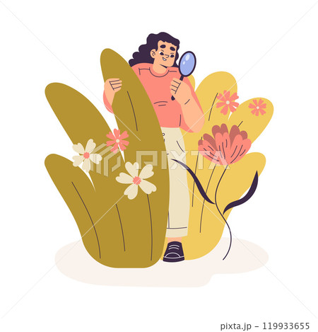 Girl Studying Plant with Magnifier Exploring Nature Vector Illustration